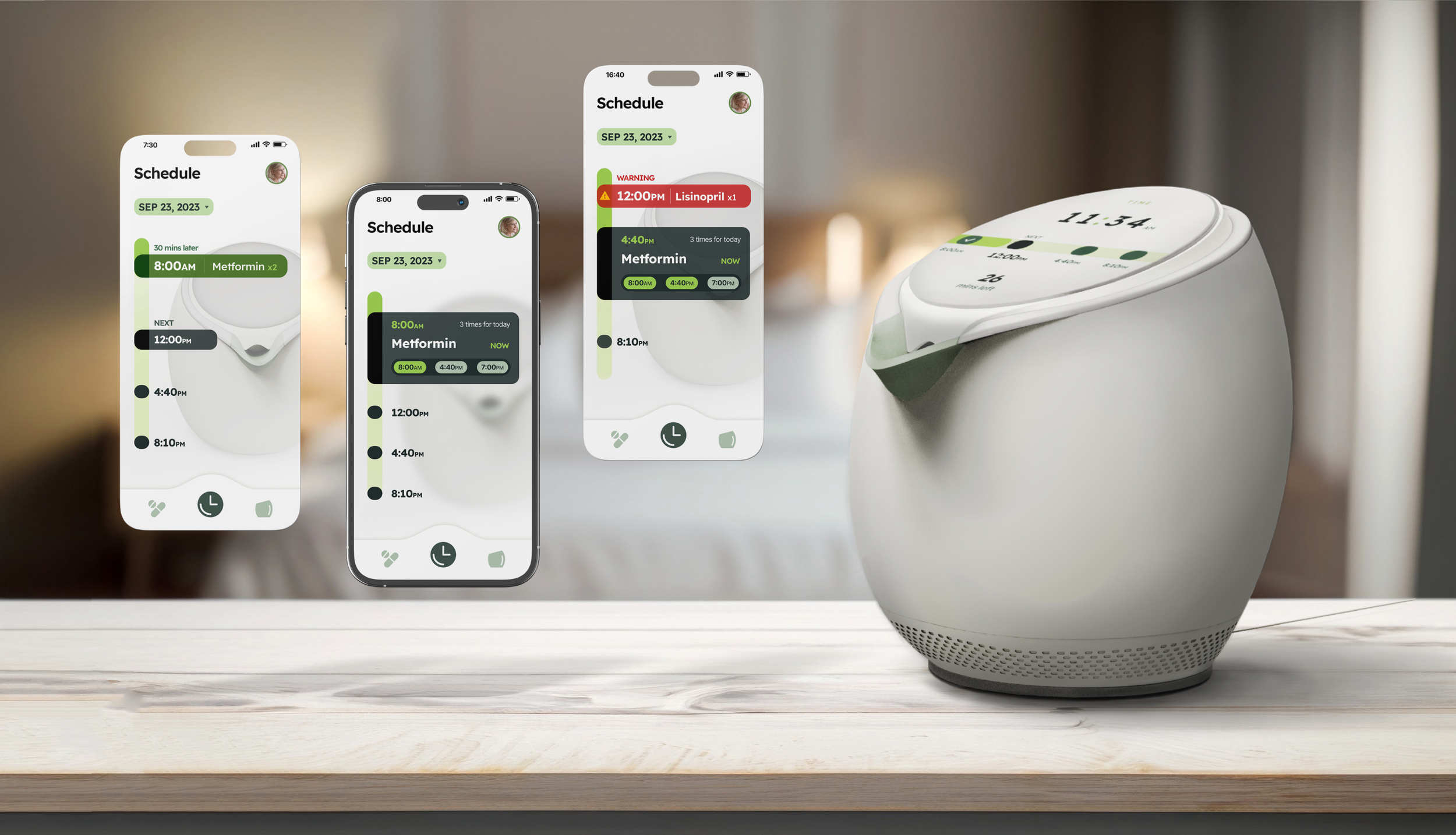 Clear medication reminder times are displayed prominently with gentle chimes and friendly messages, ensuring a reassuring, non-intrusive experience.