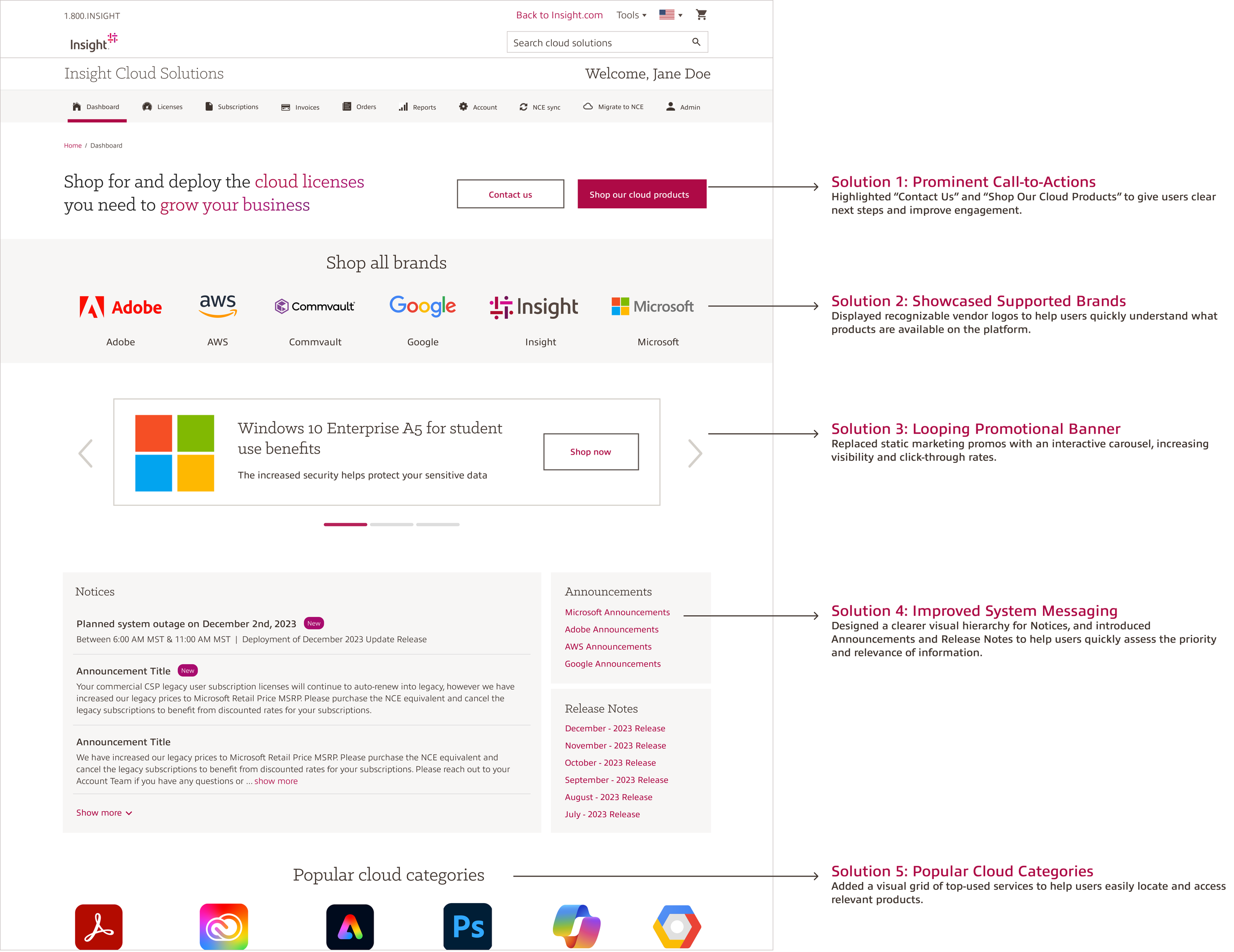 Redesigned the Cloud platform dashboard to enhance user satisfaction and accessibility by introducing personalized marketing content and user-driven notifications. Based on feedback and usage data, the new design improved engagement and led to a 5% increase in conversions. In March 2025, we successfully onboarded AWS as a new vendor, establishing a strong collaboration that expanded our service offerings and aligned with evolving customer needs.