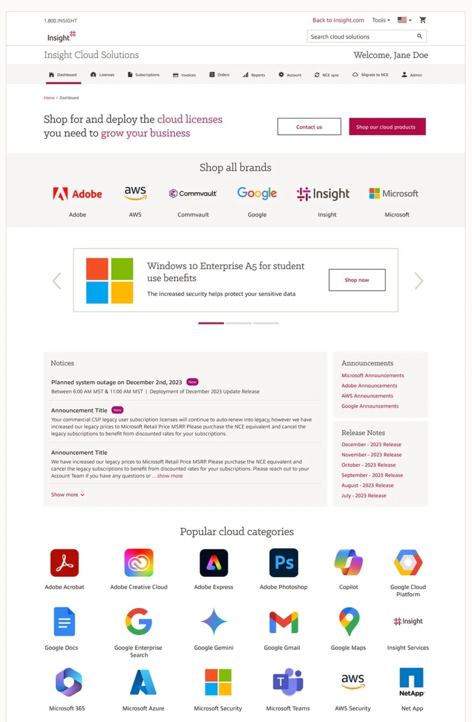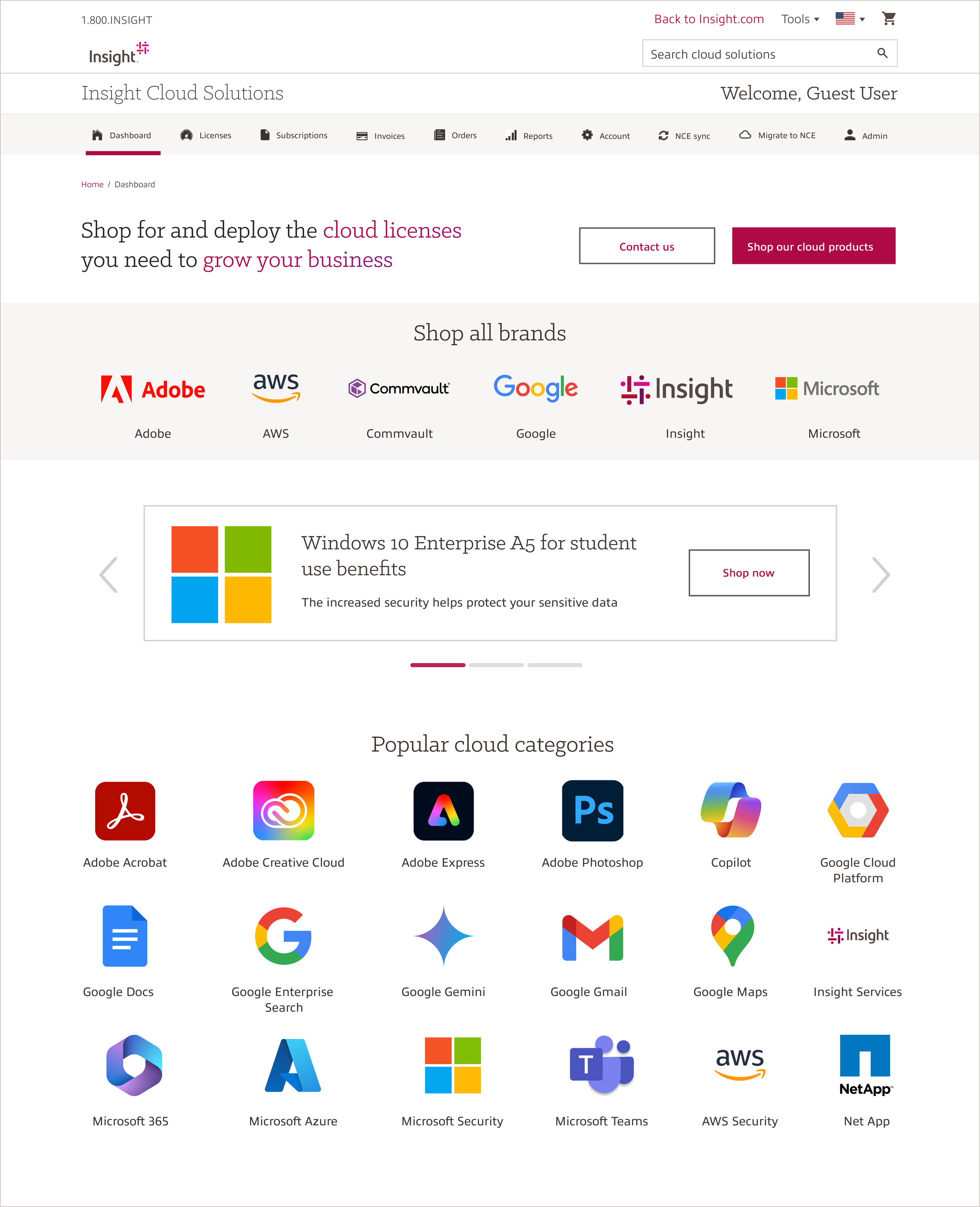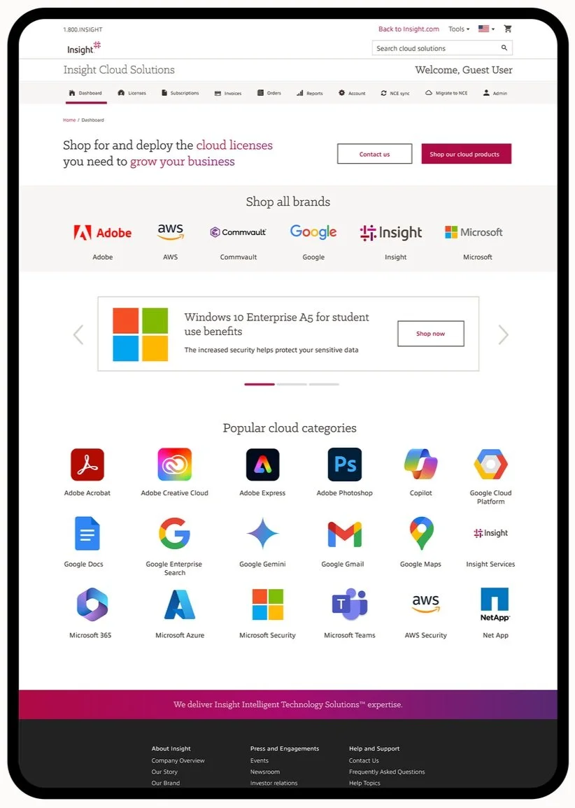 The Cloud Platform is a B2B SaaS e-commerce marketplace that enables businesses to purchase, manage, and scale software solutions from leading vendors like Microsoft, Adobe, AWS, and Google. It offers services including Adobe VIP Marketplace, AWS Marketplace, Microsoft Azure Marketplace, Microsoft CSP, and Insight Packaged Services—all designed to streamline software procurement and cloud service management.