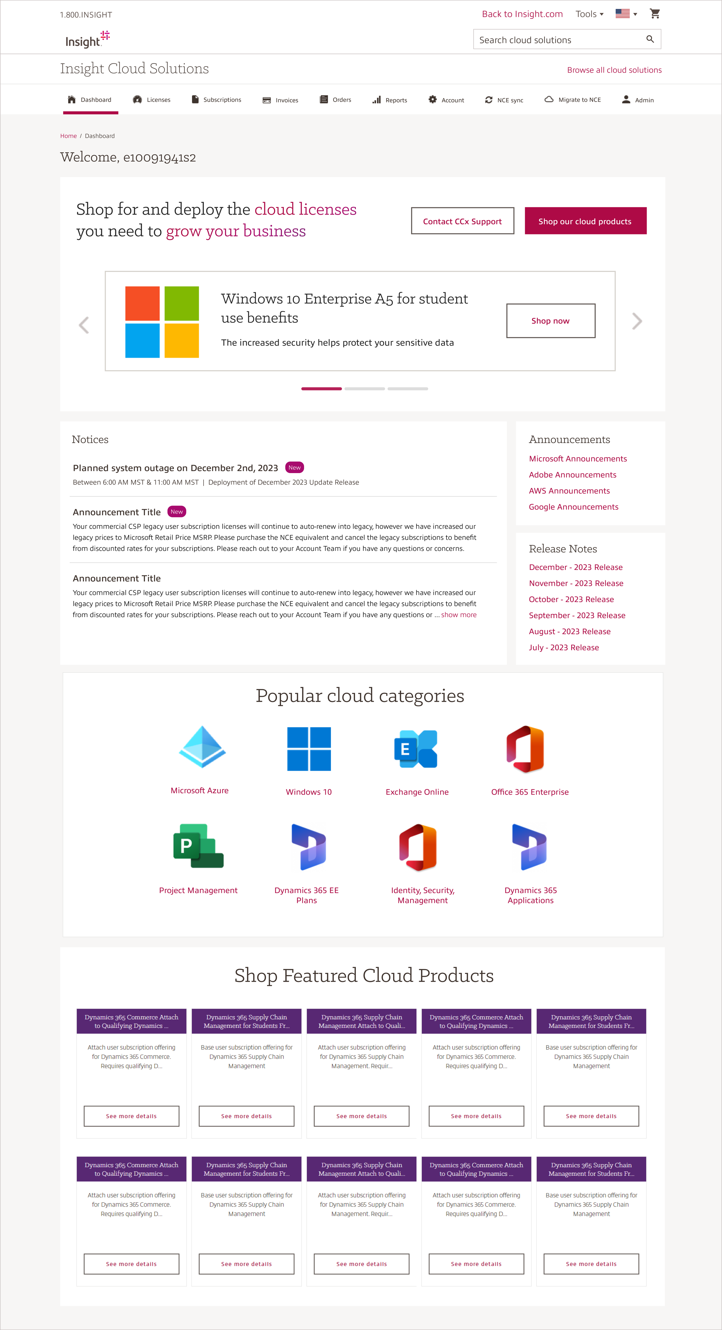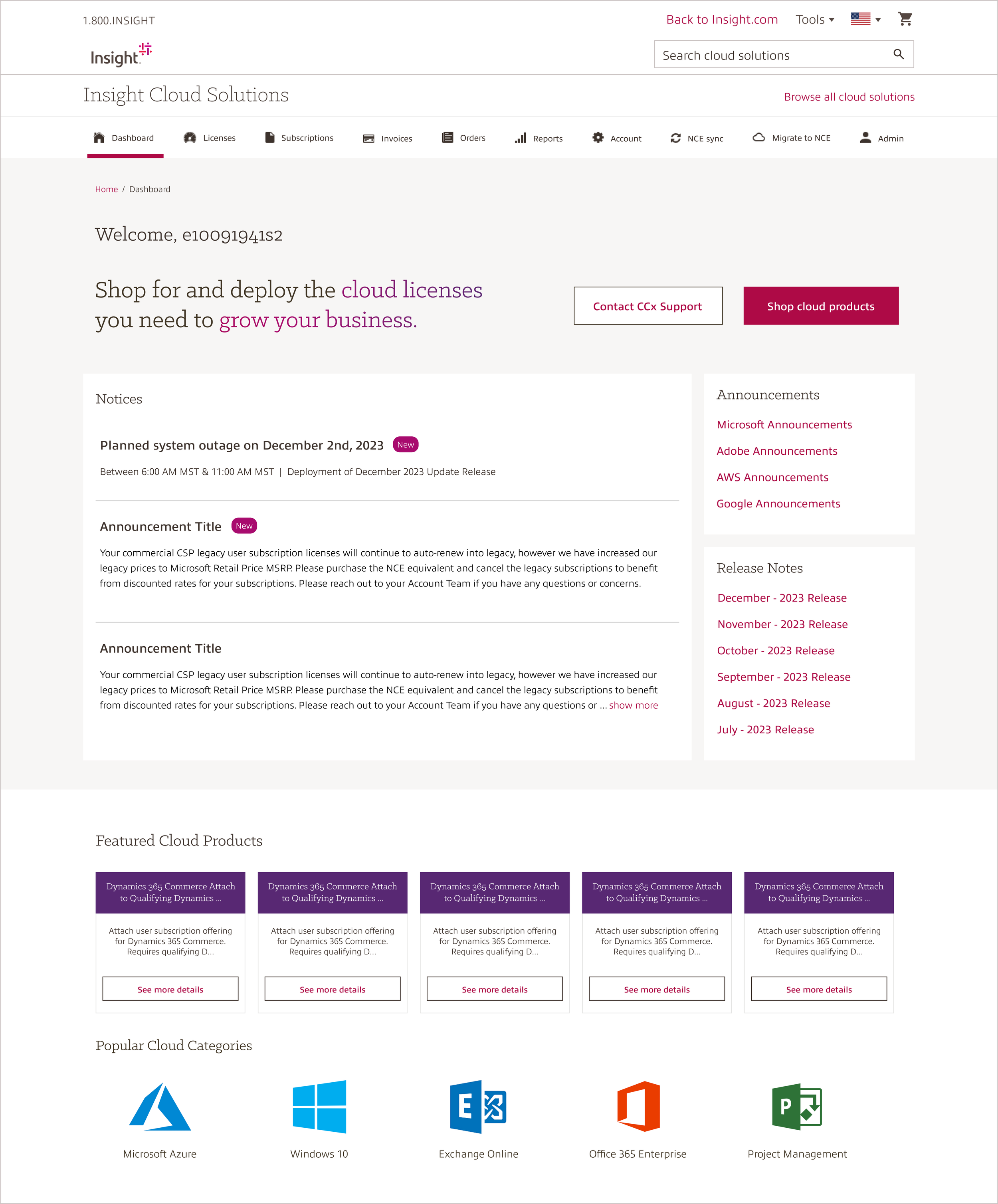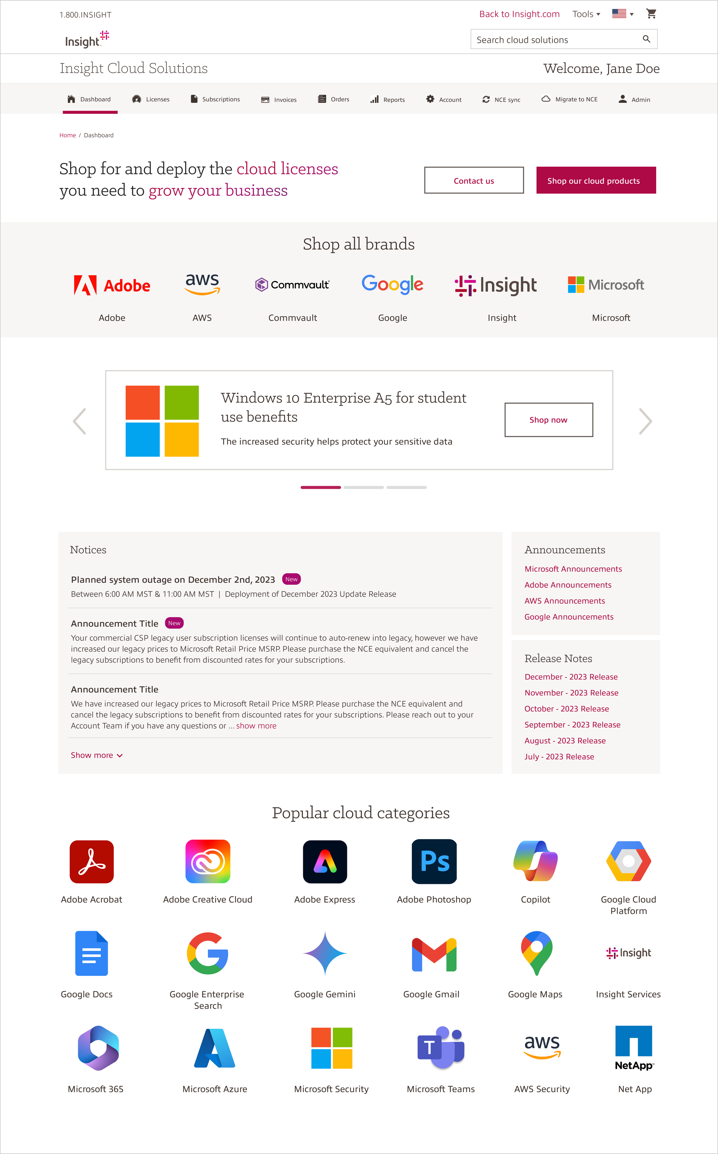The Cloud Platform is a B2B SaaS e-commerce marketplace that enables businesses to purchase, manage, and scale software solutions from leading vendors like Microsoft, Adobe, AWS, and Google. It offers services including Adobe VIP Marketplace, AWS Marketplace, Microsoft Azure Marketplace, Microsoft CSP, and Insight Packaged Services—all designed to streamline software procurement and cloud service management.