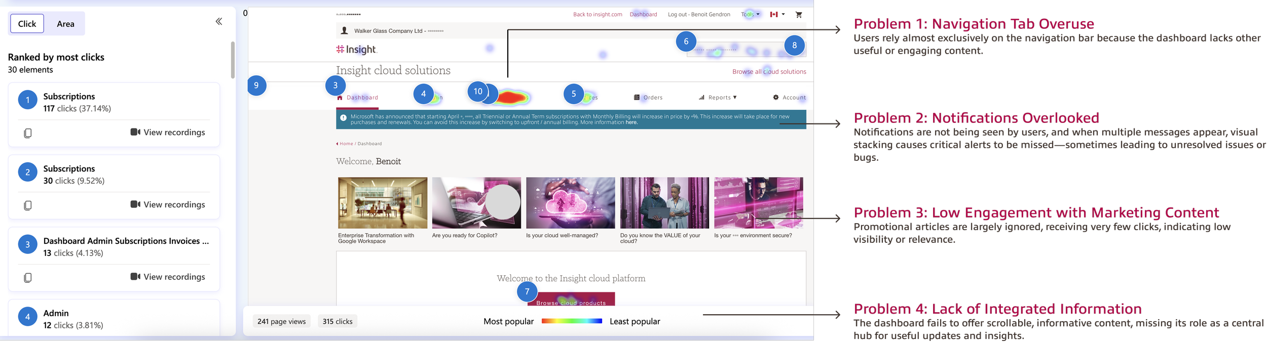 Through weekly reviews using Microsoft Clarity and heatmap analysis, we found that users weren’t scrolling or engaging with the dashboard, leaving valuable space underutilized. As the main landing page, the dashboard lacked clarity, didn’t display key content effectively, and had no dedicated area for important notifications, leading to user complaints and missed communication opportunities.