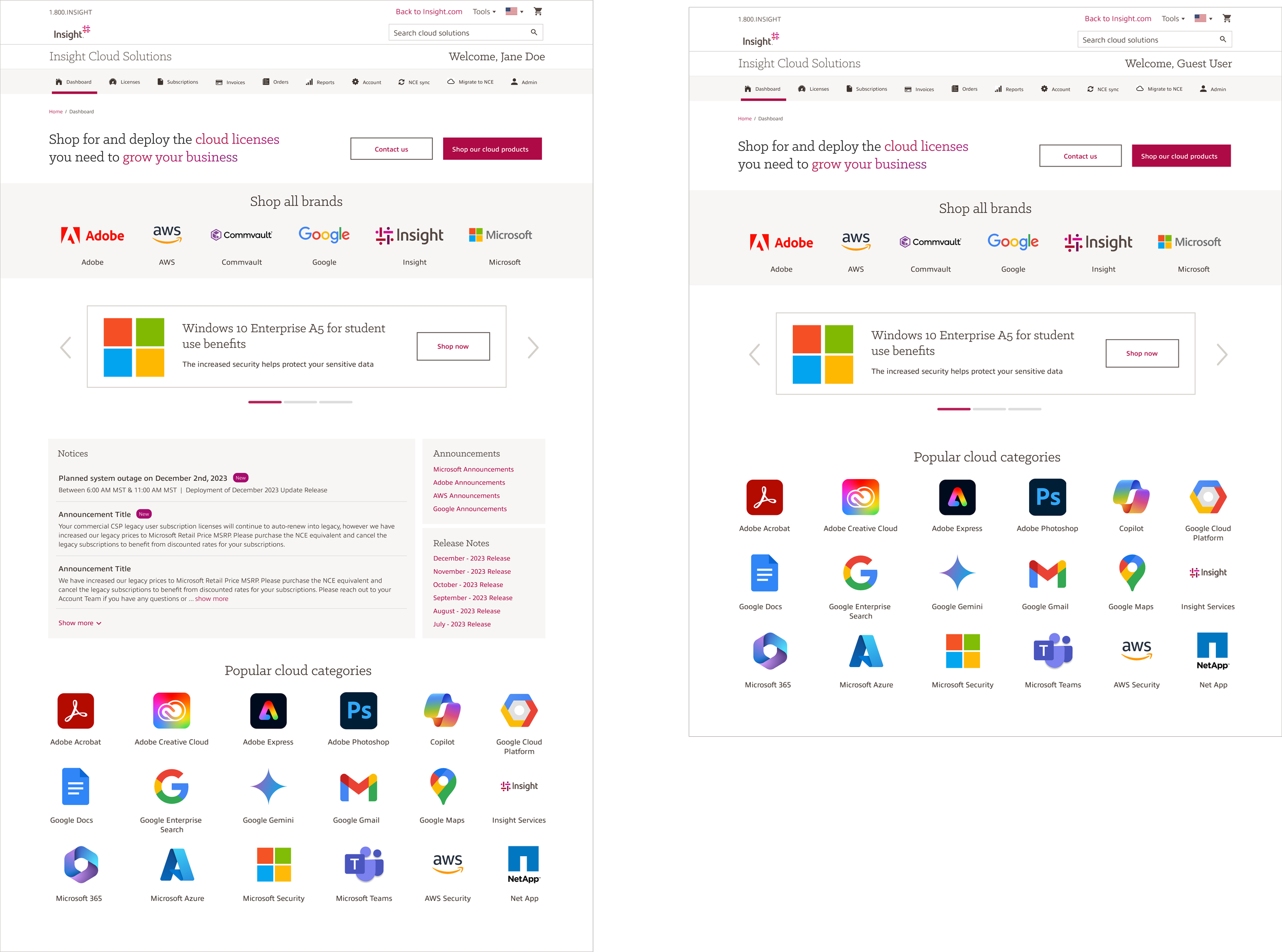 Clear “Contact us” and “Shop our cloud products” CTAs guide guests toward meaningful actions—driving leads and purchases even before account creation.Informs Personalized Onboarding