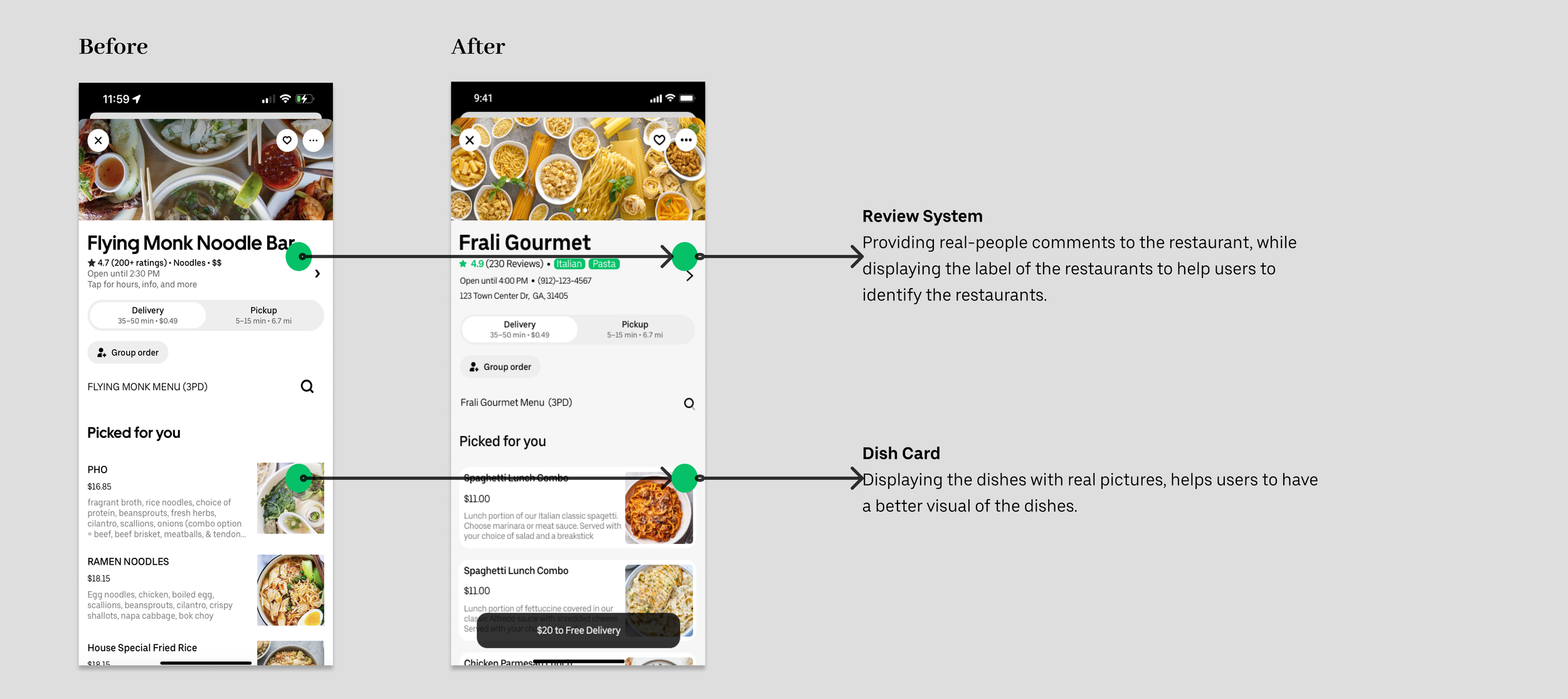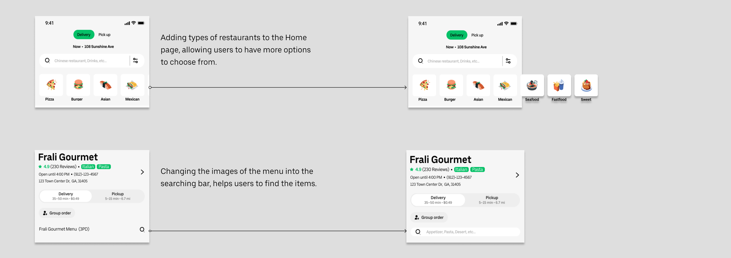 For the project, I am creating a better structure of user experience & user interface process to help users select the perfect restaurant based on their preferences. First, I decided to optimize the usability of Uber Eats by removing repetitive and unnecessary steps to the restaurant listing page. Second, I added comment features to the restaurants.