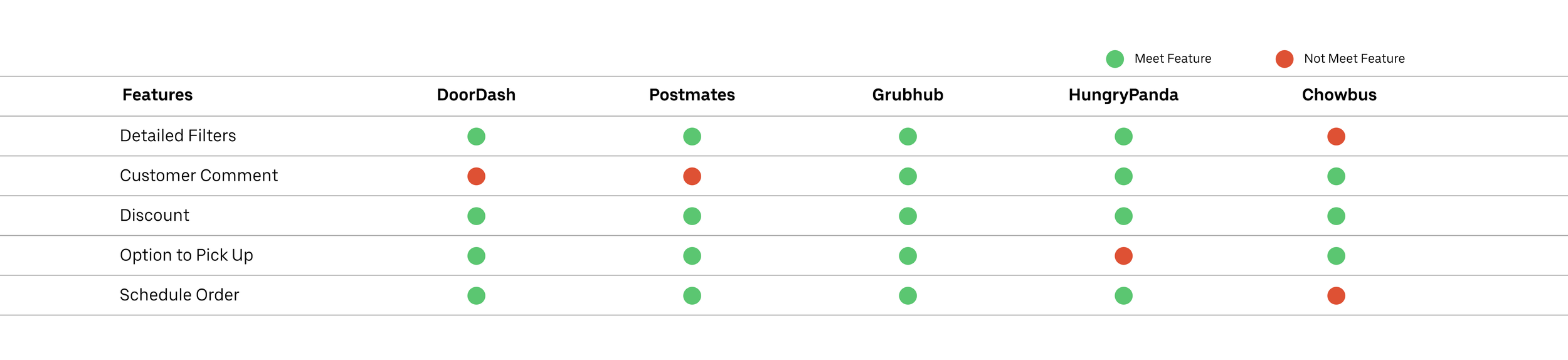 For a better understanding of the food delivery market, I researched some top companies, including (DoorDash, Postmates, Grubhub, HungryPanda, and Chowbus), while listing the features they have and do not have.